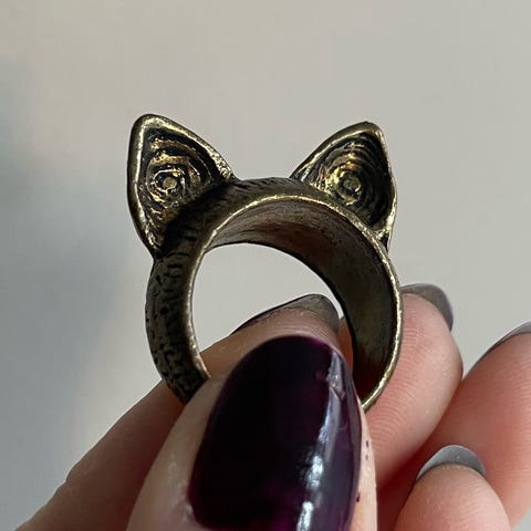 Unik statement-ring i massiv messing med et lekent og kunstnerisk figurdesign – minner om en liten katt eller fantasivesen som hviler på fingeren. Et smykke med personlighet og humor, samtidig som det har en rå, skulpturell kvalitet.