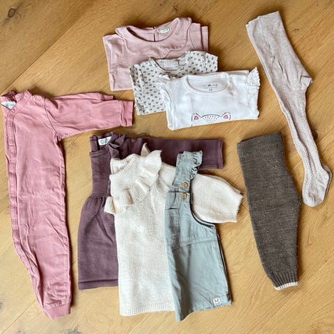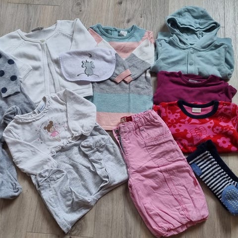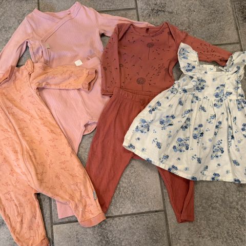 6 stk bomullsbody, 1 stk ullbody, 1 stk bambusbody, 1 stk genser, 1 stk bukse, 1 stk kjole og 2 stk pysjamas.