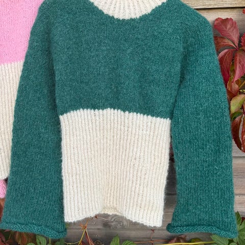 Selger denne fine Vollan genseren min i en superfin oliven grønn farge og en nydelig dus rosa farge. Genseren er av børstet alpakka og mohair garn.