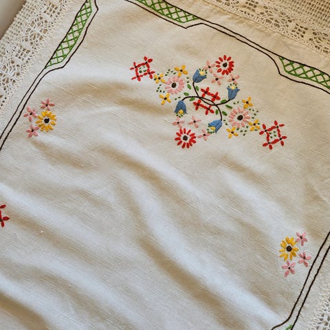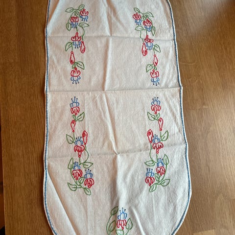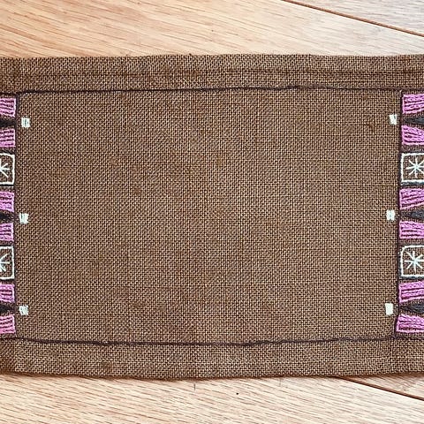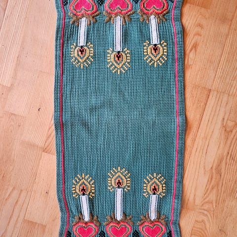 Bl.a 2 x hekkede brikker som er brodert inn.