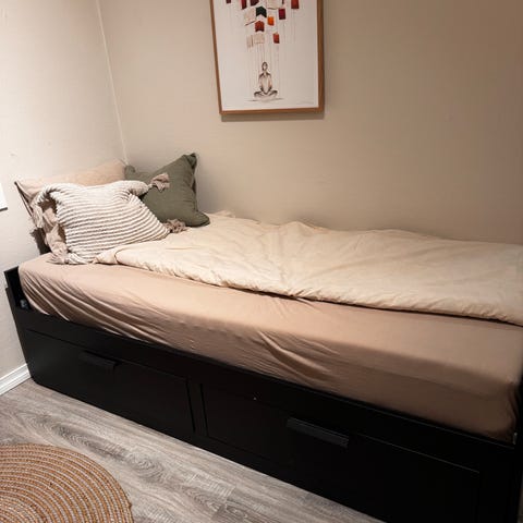 Oppe - 90 x 200 og nede 140/150 x 200.