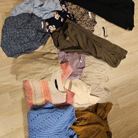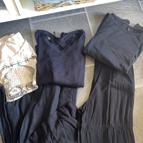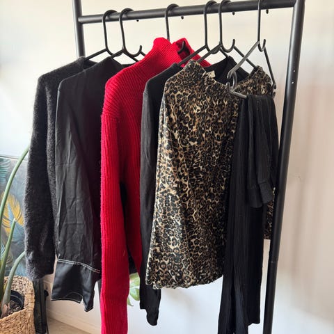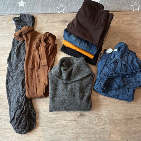 3 stk varme gensere 2 stk bukser grå(1 ny!) , beige bluse og grå bluse . Smykke i natur utførelse . 1 brun kjole, 1 vår beige ytterjakke. Jeans skjorte , leopard genser ny , beige chinos bukse . Leopard brun kjole .Hvit bomulls bluse Klærne passer til hverdags bruk eller inne jobb .