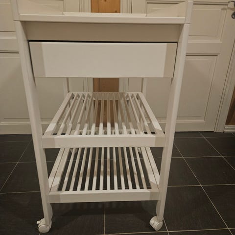 Praktisk og solid stellebord fra Troll med skuff og 2 hyller. Romslig med god plass til både klær og bleier. Noe bruksmerker som vist på bilder, men stødig og mye bruk igjen, som nytt med et lite malingsstrøk! 92 x 72 x 55 cm stort. Ny pris ca 3000 kr.