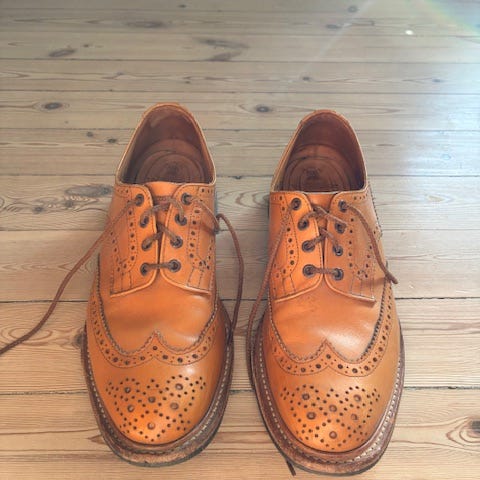 Nydelige brogues fra Sanders selges fordi de er for store for meg. Disse er i størrelse 43, men passer bedre til 44. Ken-lesten er veldig stor i størrelsen. Diplomat-linjen er den beste fra Sanders. Goodyear welted. Obs: venstre sko har en mørk flekk oppå tåen, derfor selges de rimelig. Skotre følger ikke med.