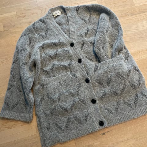 Nydelig grå cardigan fra Holzweiler i modellen Dumbo Knit selges da den ikke blir brukt. Kjøpt på Holzweiler-butikken for 2800,-. Fremstår i meget fin stand ettersom at den er brukt et par ganger. Ingen nupper eller merker. Oppleves som romslig i størrelsen, og kan nok passe en M også.