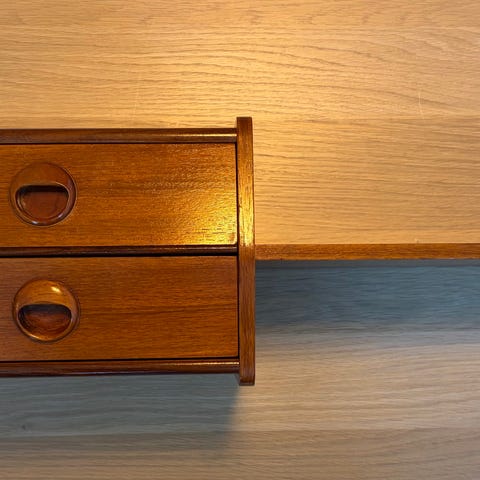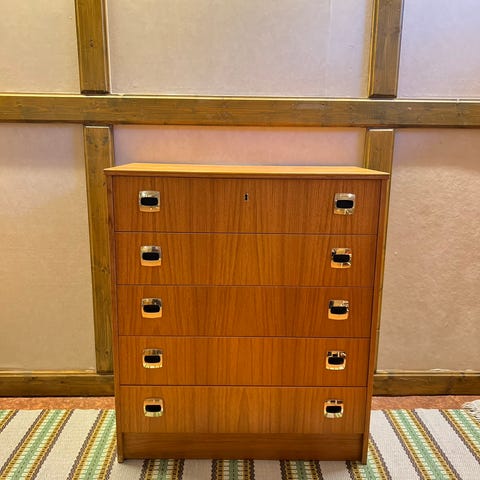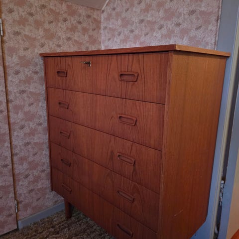 Eldre teak kommode i klassisk skandinavisk stil, trolig fra 50/60-tallet.