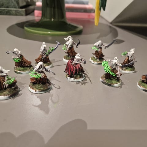 Diverse Dark Eldar figurer med esker til å ha de i. Noe malt. Noe grunnet. Litt småting mangler på noen figurer, sjekk bilder.