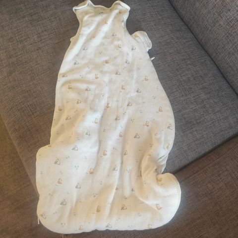 Pent brukt sovepose til nyfødt/baby. Kjøpt brukt og merkelappen er fjernet. Tror den originalt er fra IKEA og at det er TOG 1,5. Den er tynn og lett; passer fint til alle årstider, med riktig bekledning inni.