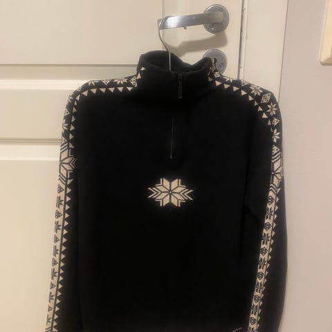 Dale of Norway genser i ull, størrelse M for dame. Genseren har rød farge med mønsterdetaljer og halv glidelås i front. Ermene har stripete design med glidelåslomme på venstre arm.