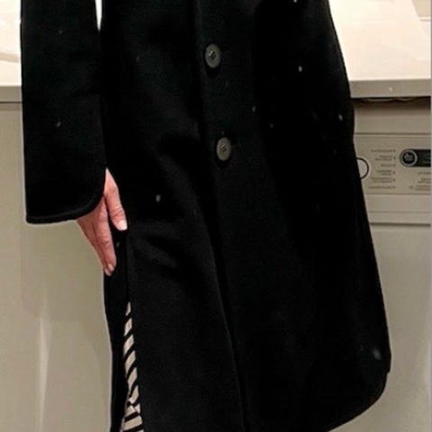 Kåpe i lammeull fra Sportmax, str 42, dvs ca 38. Lukkes ved hja belte, knapper øverst. Belte tres på en spesiell måte men jeg har brukt som omslag. Split i hver side. Delvis foret (se bilde). Lengde fra hals og ned ca 105cm