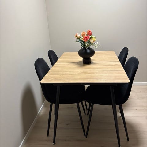 Kan lett forlenges av én person. Tilleggsplata oppbevares lett tilgjengelig under bordplata når den ikke brukes. Den klarlakkerte overflaten er enkel å tørke av med en klut.Plass til 4-6 personer