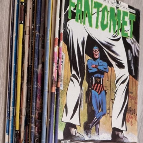En samling av diverse barnebøker og tegneserier i forskjellige størrelser og farger. Inkluderer blant annet en Lek og Lær bok med rødt omslag. Passer for barn og unge lesere. Gis bort