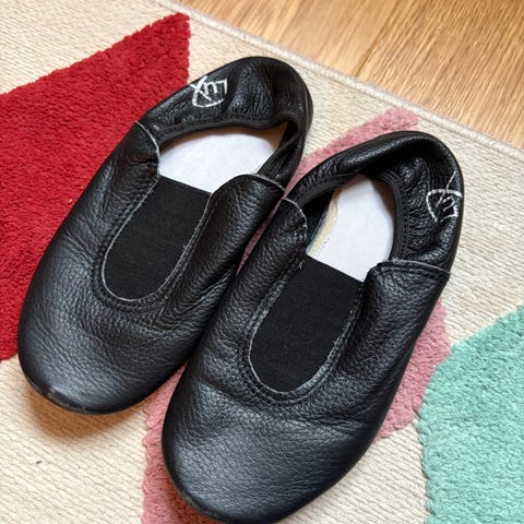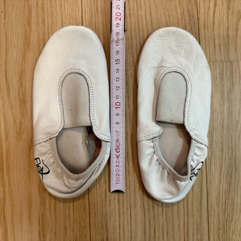 Gymsko i skinn, med gummisåle under tåballen og hælen. Dette forhindrer at du sklir på gulvet. Perfekt til enkel gym og inne trening. Må sitte tett på foten. Utvider seg i bruk. Oppleves litt kort på størrelse. Kjøp gjerne en størrelse større enn normal. Disse er str 29, og er brukt av ett barn til turn. Nypris 280kr