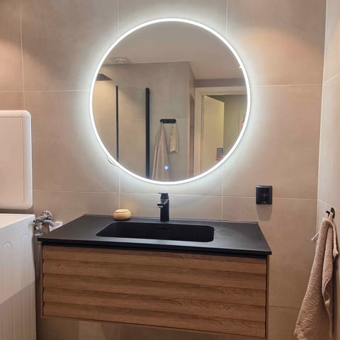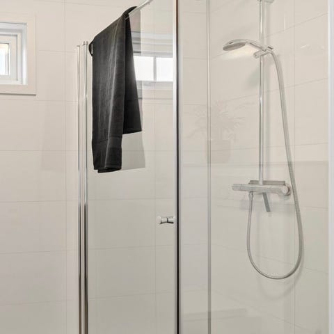 Dusjkabinett med buet glassdør i klart og frostet glass. Passer til hjørneinstallasjon. Inkluderer håndtak i metall og magnetlist for lukking. Egnet for baderom med begrenset plass.