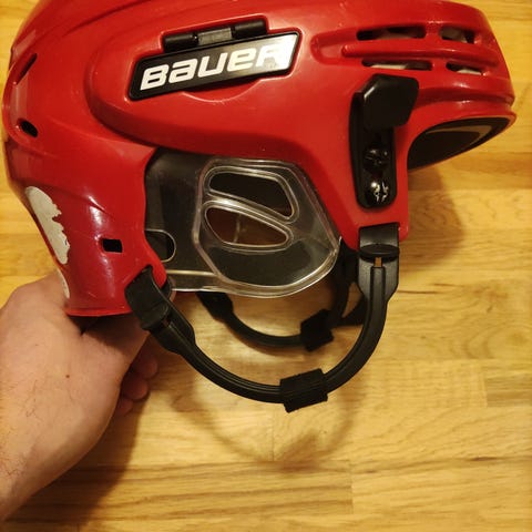Bauer hockey hjelm med gitter. Rød. Usikker på størrelsen, men brukt av gutt 9-11 år.