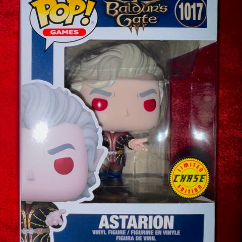 Funko Pop! Baldur's Gate Astarion figur med modellnummer 1017. Figuren er en samlerfigur fra spillserien Baldur's Gate, fremstilt i vinylmateriale med detaljer som grått hår og røde øyne. Den er uåpnet.