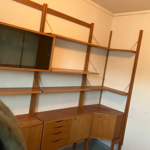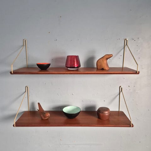 Teak hylle med stringoppheng. Nyproduserte bøyler og resulkulert teak! Disse er 75 cm bred og 20 cm dyp. Jeg har flere hyller og kan levere i flere bredder!! 600,- pr.stk.