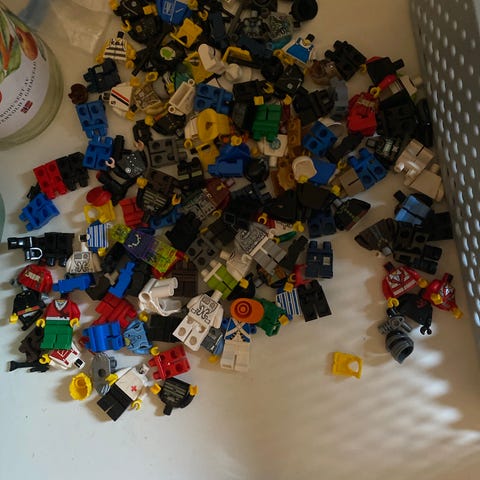 LEGO Minifigures samling med ulike minifigurer og tilbehør. Inneholder flere små deler og figurer i forskjellige farger og former, lagret i en plastboks med flere rom for organisering.