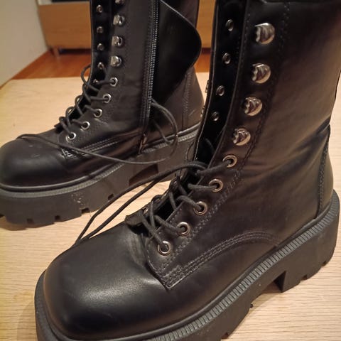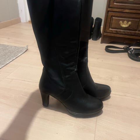 Tamaris støvletter i størrelse 38, svart farge. Støvlene har en glatt, blank overflate med et mønster som gir tekstur. De har en middels høy hæl og en spiss tupp.