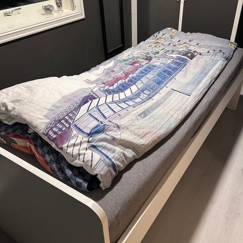 IKEA seng med tilhørende madrass og et svart bord. Sengen har en enkel design med lys og blå rutete farge på rammemadrassen. Bein medfølger.