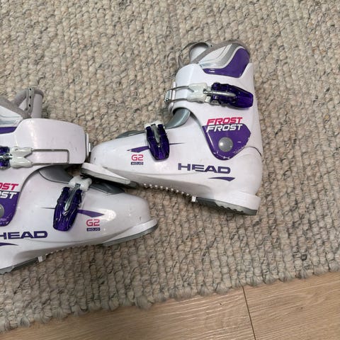 Lange støvler i størrelse mm291. Støvlene er hvite og designet for alpint bruk. De har flere spenner for justering og er laget for å gi støtte og kontroll under skikjøring.
