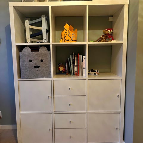 IKEA kallax hylle med noen grå tekstilbokser. Nesten ikke brukt, kun stått i et hjørne å tatt opp plass. Må hentes.