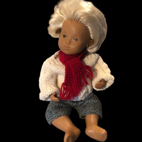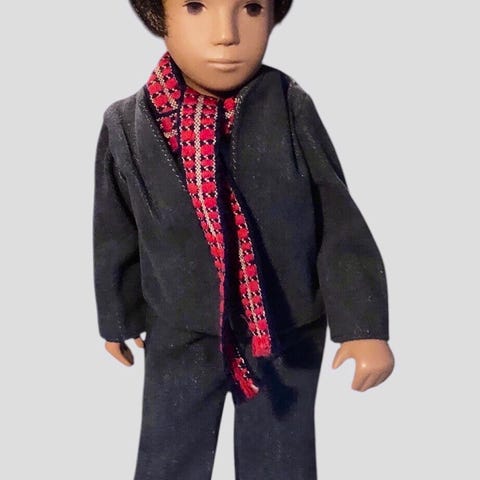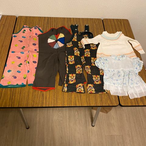 Klær som på bildet: jakke, votter, snekkerbukse, strikket genser og vinterstøvler.