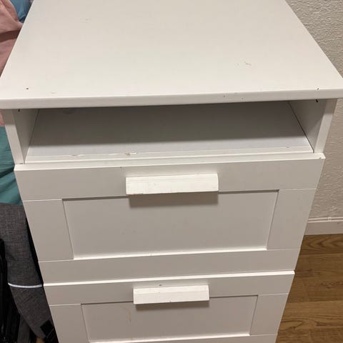 Nattbord fra IKEA som er malt i svart farge. Nattbordet var et DIY-prosjekt. Ikke verdens beste, men duger.