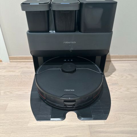 Roborock S5 Max robotstøvsuger i hvit farge. Produktet inkluderer støvsuger med tilhørende vannbeholder, mopp, støvbeholder og ladestasjon. Designet for automatisert rengjøring av gulvflater.