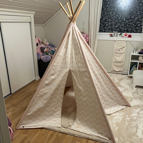 Alice & Fox leketelt for barn i tekstil med husdesign. Teltet har vinduer og døråpning, og er laget for innendørs bruk som et lekerom for barn.