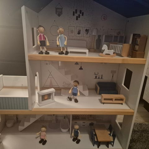 Lundby dukkehus med masse figurer, møbler og tilbehør selges. Strømforsyning og fjærnkontroll til lys.
