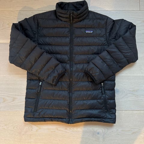 Patagonia barnejakke i størrelse 10år. Jakken er grå blå med rustrøde(orange) detaljer på skuldre og hette.