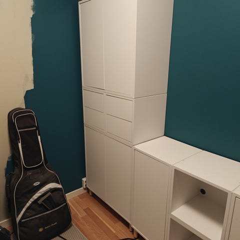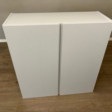 Skap med speildør. Står vikedal (ikea) på døra, usikker på om skapet også heter vikedal da jeg ikke finner ut av det. Vi har brukt det som skoskap. Er med 8 skohyller og 1 flat hylle. Bredde 50cm. Dybde 38cm.