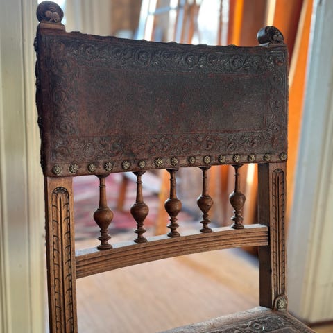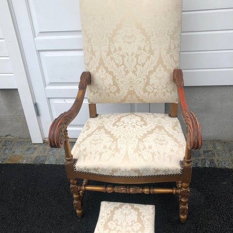 Denne stolen ble funnet i en kjeller på 80-tallet, så derfor har jeg ikke historien, men har gjort litt research og tror at dette er en dansk stol, i nyrenessanse, fra perioden sent 1800- tidlig 1900-tall.