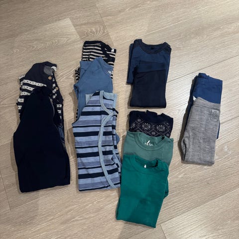 Selger 7 ullbodyer og 1 ulltopp i størrelse 92, alle pent brukt uten hull. Noen av bodyene har små flekker og nupper, som har ingenting å si for bruk, men se gjerne bilder for anmerkninger. Alt ble kun vasket med ullvaskemiddel i ullprogram, tok også en ny vask før salg.