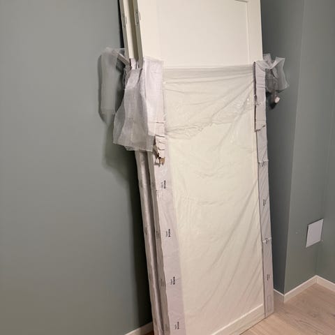 Døren har vært montert en kort periode, men er nå tatt ned igjen da vi måtte bytte til en lyd- og brannklassifisert dør etter innflytting i nytt hus.