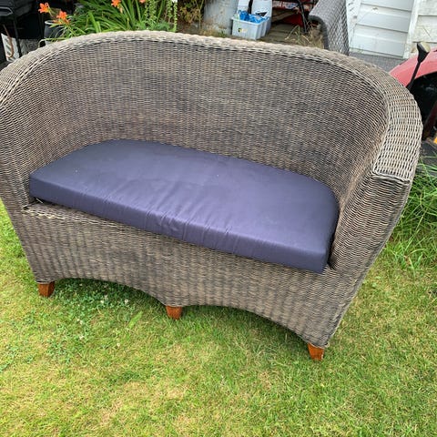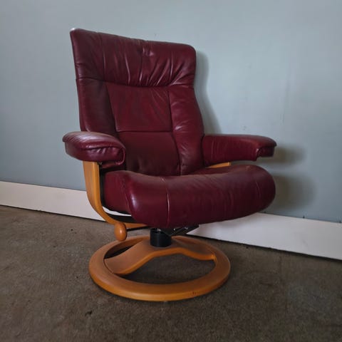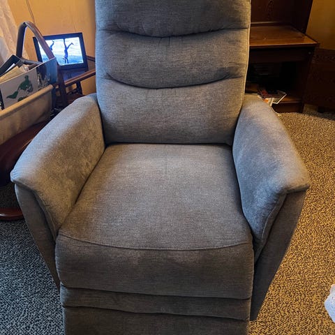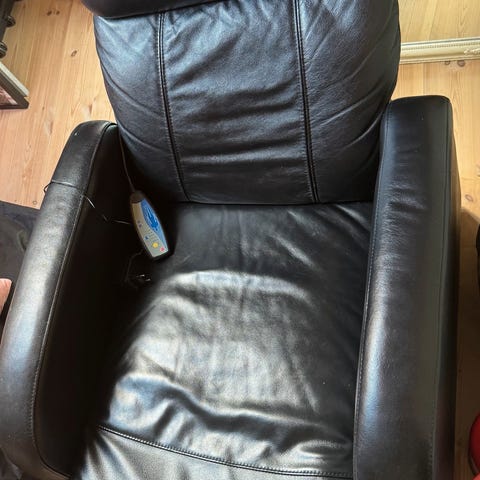 Synlig brukt hvilestol i fargen grå. Beina kan tas opp og ryggen bak, lett å kose seg i 🤭