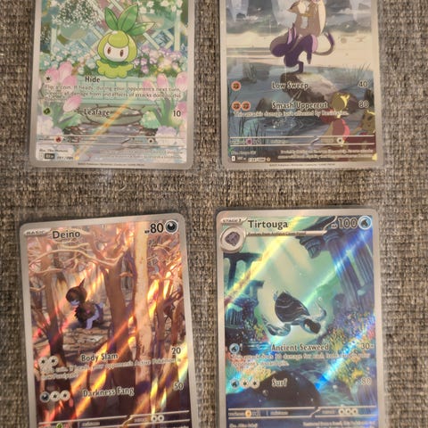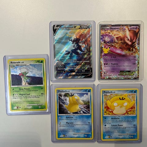 Samling av Pokémon-kort med ulike karakterer inkludert Researcher, Psyduck, og flere. Kortene har forskjellige farger og illustrasjoner, og kan brukes til samling eller spill.