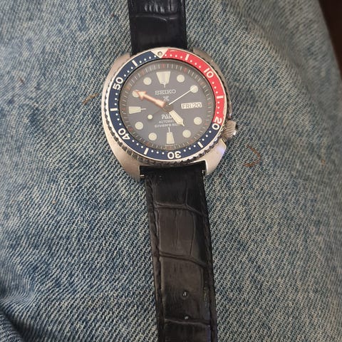 Seiko klokke med svart rem, designet for herre. Klokken har en rund urskive med tydelige markeringer og visere, egnet for daglig bruk.