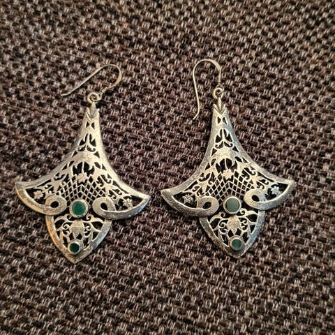 Øredobbene har naturlig brukspatina, og vil bli enda finere med en runde sølvpuss dersom man ønsker en blankere finish – detaljene og formen kommer ekstra godt frem da.