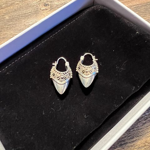 Et par dekorative øredobber i sølv med et tydelig tribal- og Bali-inspirert uttrykk. Små hoops med ornamenterte detaljer og klassiske elementer som gir et håndverksmessig, tidløst preg med bohemske vibber. Lette og behagelige å ha på, og passer like godt til hverdags som til mer pyntede anledninger.