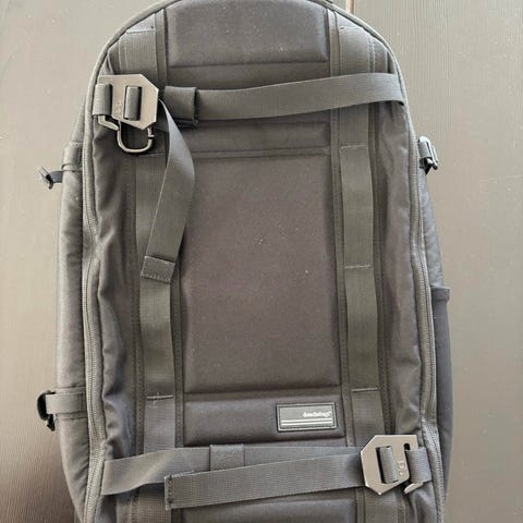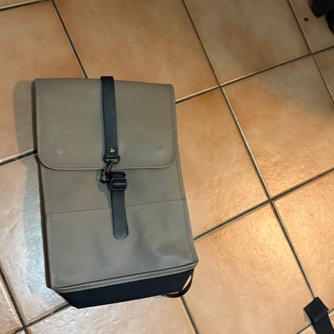 Rains ryggsekk i svart kunstlær, designet for unisex bruk. Sekken har en toppklaff med spenner, justerbare skulderstropper og PC-lomme på innsiden. Rommer 21l, har et mindre bruksmerke på baksiden. Ellers i god stand, må hentes på Ulven