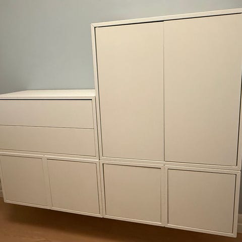 Pent brukte Ivar skap malt i beige grå farge selges. 700,- per skap.