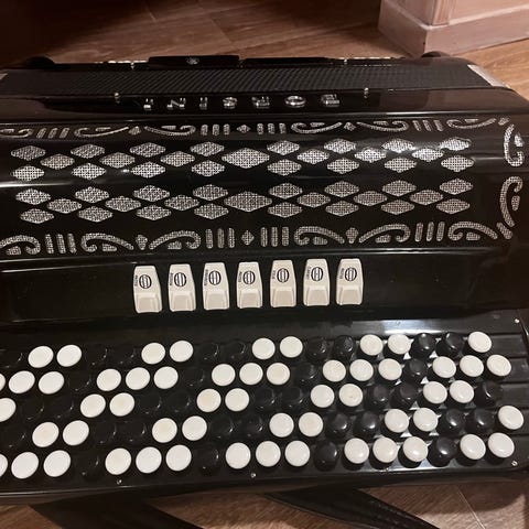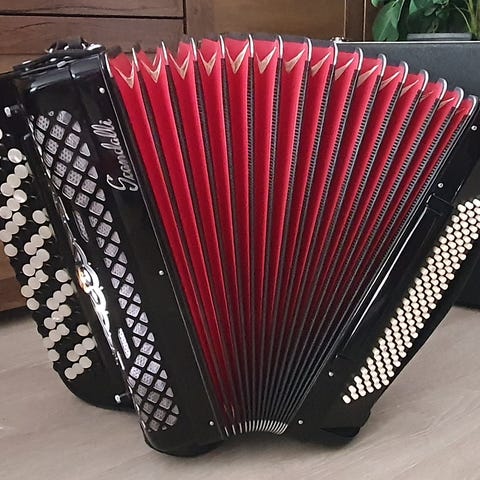 Selger et Pigini trekkspill, 4 korig/ m Cassotto, hakeregister og standard bass. Spillet har svensk system.