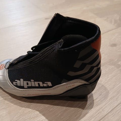 Alpina skisko i størrelse 30. Skiskoene har glidelås og snøring med lås, så det er lett å få dem av og på.