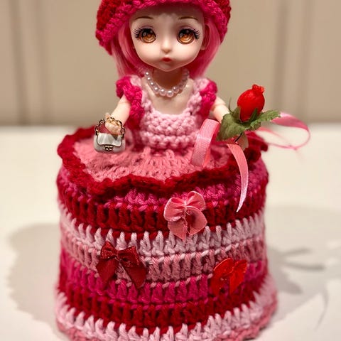 Søkeord: Håndlaget Retro Gammeldags Heklet Hekling Dukke Dokke Dorull Toalett Bad Pynt Håndarbeid Fargerikt Hjemmelaget Kjole Gaver