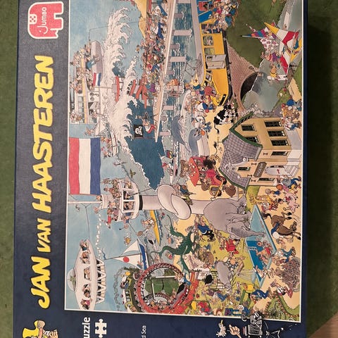 Jan van Haasteren puslespill med 1000 brikker. Puslespillet har et detaljert og fargerikt motiv typisk for Jan van Haasterens stil.
