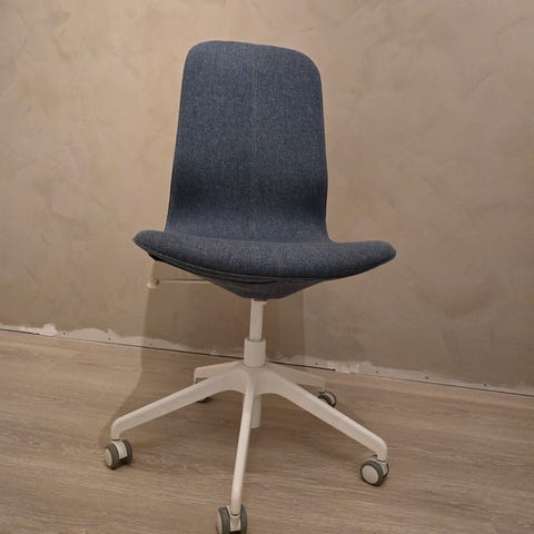 Behagelig kontorstol. En flekk i setet som sikkert kan fjernes. Hjulene ruller ikke så godt, har ikke sett på hvorfor.
