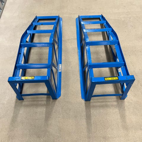 Metallramper med perforert overflate for bedre grep. Passer til løfting eller lasting av kjøretøy eller utstyr. Robust konstruksjon i metall.
