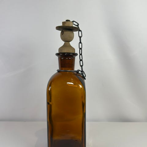 Selger et dekorativt sett med to vintage-inspirerte glassflasker i originalt metallstativ med håndtak. Flaskene har antikk finish med patinert speilglass og gir et eksklusivt, rustikt uttrykk.